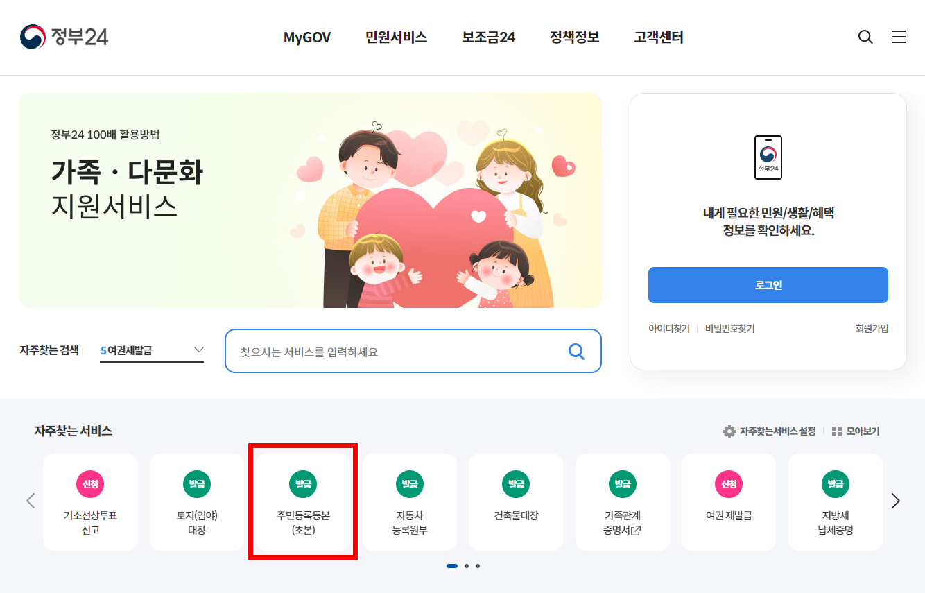 로그인 후, 상단 메뉴에서 '민원서비스'를 선택하고, '주민등록등본(초본) 발급' 항목을 클릭합니다. 검색창에 "주민등록등본"을 입력해 바로 찾을 수도 있습니다.