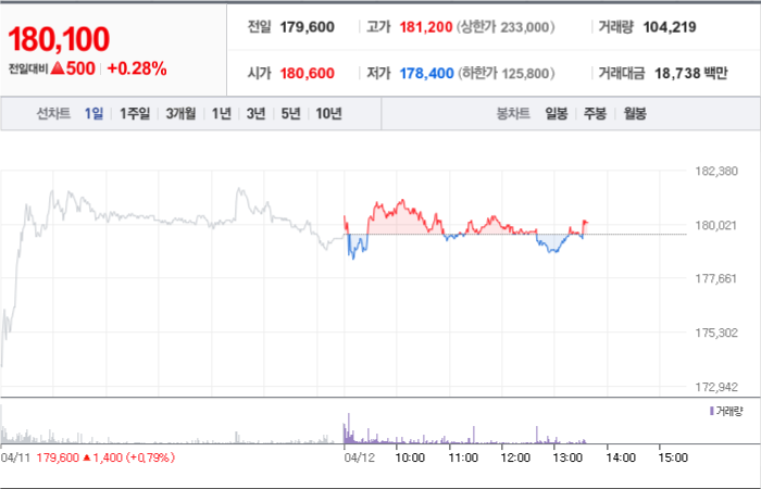 레인보우로보틱스의 현재 주가는 179,600원이며 전일 대비 원의 모습을 보이고 있습니다. 주주현황을 살펴보면 오준호(외 7인)이 지분 58.79%를 소유하고 있습니다. 이 회사는 기계 기업으로, 장중 기준으로 주가는 179,600원입니다. 시가 총액은 3조4920억 원이며 발행 주식수는 19,399,858주입니다. 외국인 보유 비중은 4.90%이며 장중 거래량은 151,127을 기록했습니다. 또한, 매출액은 153억 원을 달성했습니다.