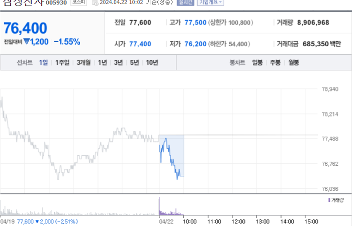 삼성전자의 현재 주가는 77,600원이며 전일 대비 -2,000원으로 하락하였습니다. 주주현황을 살펴보면 삼성생명보험을 포함한 외국인 16인이 지분의 20.10%를 소유하고 있습니다. 삼성전자는 반도체 및 관련장비 기업으로, 현재 주가는 77,600원입니다. 시가 총액은 456조914억 원이며 발행 주식수는 5,969,782,550주입니다. 외국인 보유 비중은 55.99%이며, 장중 거래량은 31,317,563주를 기록했습니다. 삼성전자의 매출액은 2,589,355억 원입니다.