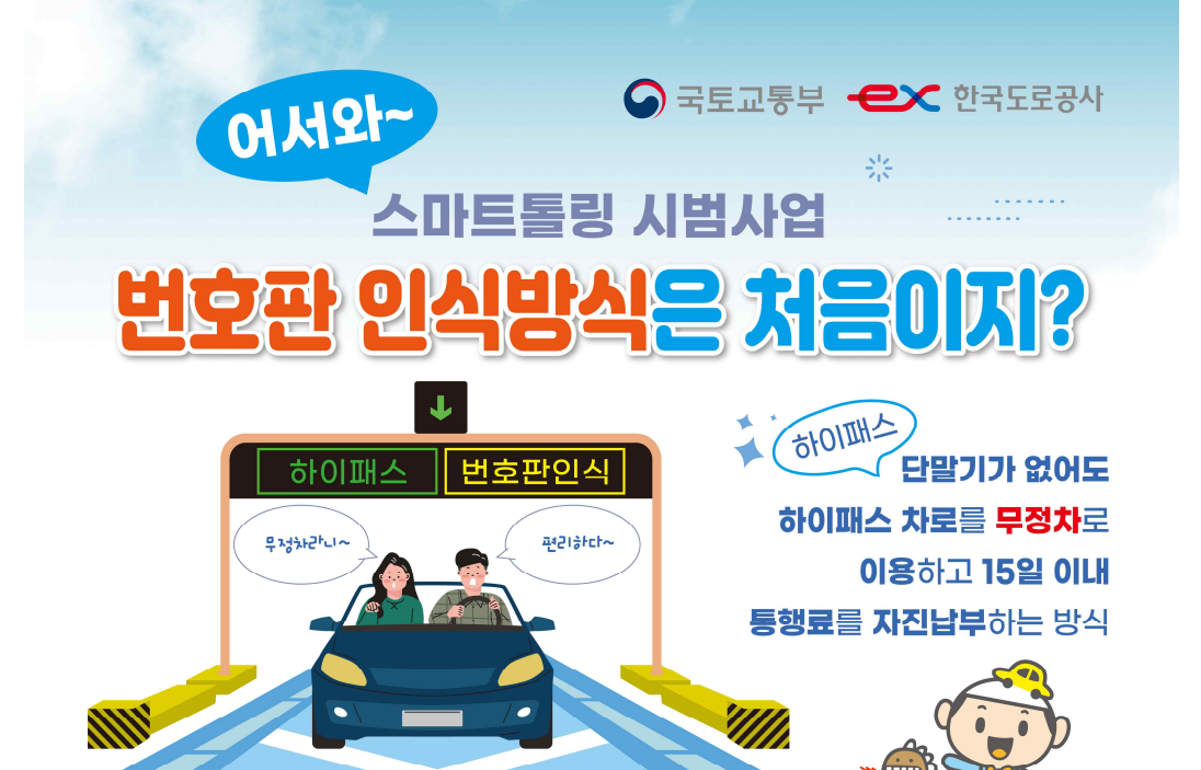 [스마트톨링]은 기존의 하이패스 시스템을 업그레이드한 새로운 톨게이트 시스템이에요. 하이패스 단말기가 없어도 번호판인식을 통해 자동으로 통행료를 지불할 수 있어요. 더 이상 하이패스 단말기를 설치하거나 충전할 필요가 없어서 정말 편리하답니다.
