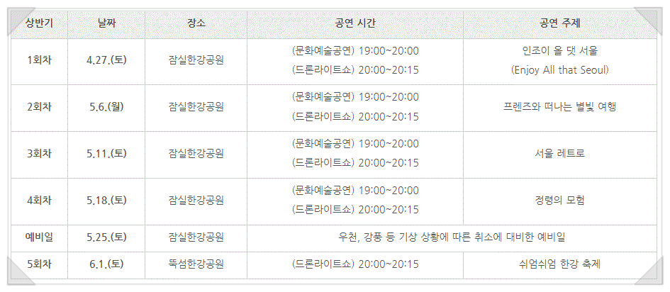 첫 번째 공연은 4월 27일 토요일에 잠실 한강공원에서 열립니다. 이날 공연은 ‘서울의 모든 것을 즐겨라’라는 테마로 1000대의 드론이 비행하며, 서울의 상징 캐릭터인 해치와 소울 프렌즈가 어떻게 표현될지 기대됩니다.
