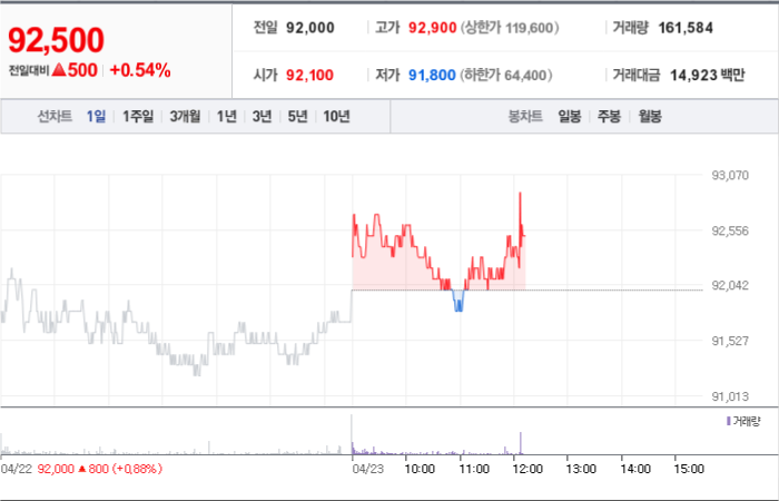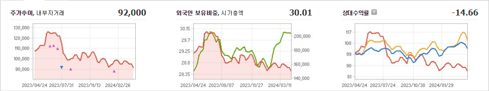 LG전자의 현재 주가는 92,000원이며 전일 대비 -7.44원의 변동을 보이고 있습니다. LG전자의 주주 구성은 LG(외 2인)이 지분의 33.68%를 소유하고 있습니다. 내구소비재 기업인 LG전자의 시가 총액은 15조1374억 원이며 발행 주식수는 163,647,814주입니다. 외국인 보유 비중은 30.01%이며 장중 거래량은 347,838주를 기록했습니다. 또한, LG전자의 매출액은 842,278억 원을 달성했습니다.