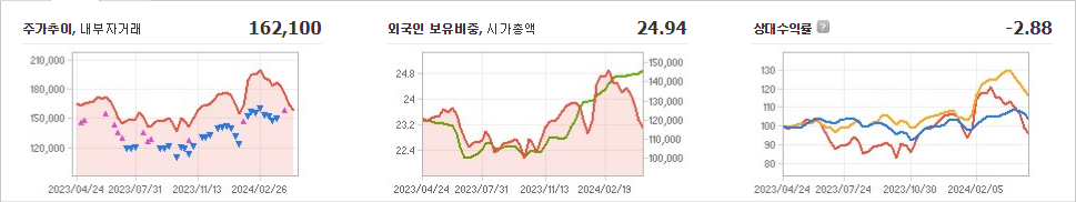 SK의 현재 주가는 162,100원이며 전일 대비 -15.22원의 변동을 보이고 있습니다. 주주현황을 살펴보면 최태원(외 40인)이 지분 25.57%를 소유하고 있습니다. SK는 석유 및 가스 기업으로, 현재 주가는 162,100원입니다. 시가 총액은 11조 9167억 원이며 발행 주식수는 73,198,329주입니다. 외국인 보유 비중은 24.94%이며 장중 거래량은 150,373주를 기록했습니다. 매출액은 1,312,379억 원입니다.
